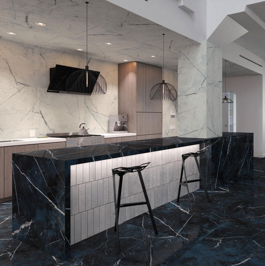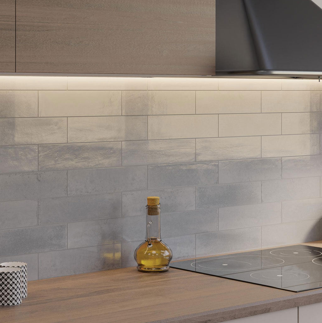 Ideal para suelos y paredes, disponible en mosaico y alargado, en un suave tono perla y acabado brillante característica del estilo agadir.