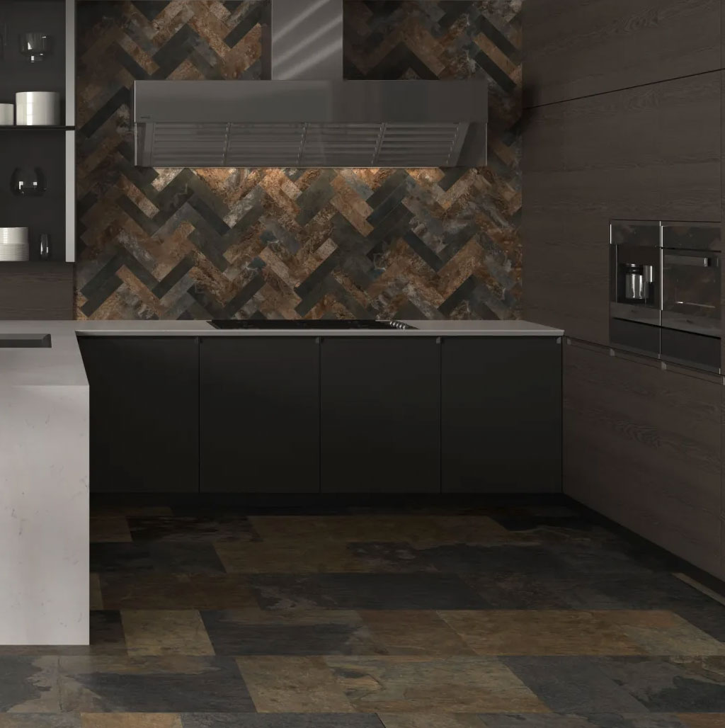 Inspirado en la pizarra multicolor, su paleta de tonos incluye negros profundos, ocres cálidos, grises y rojos oxidados, creando composiciones vibrantes y acogedoras.
