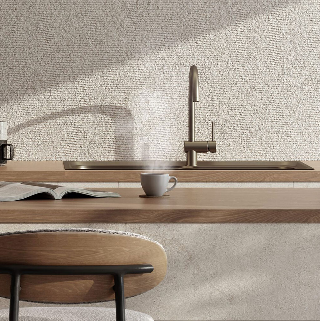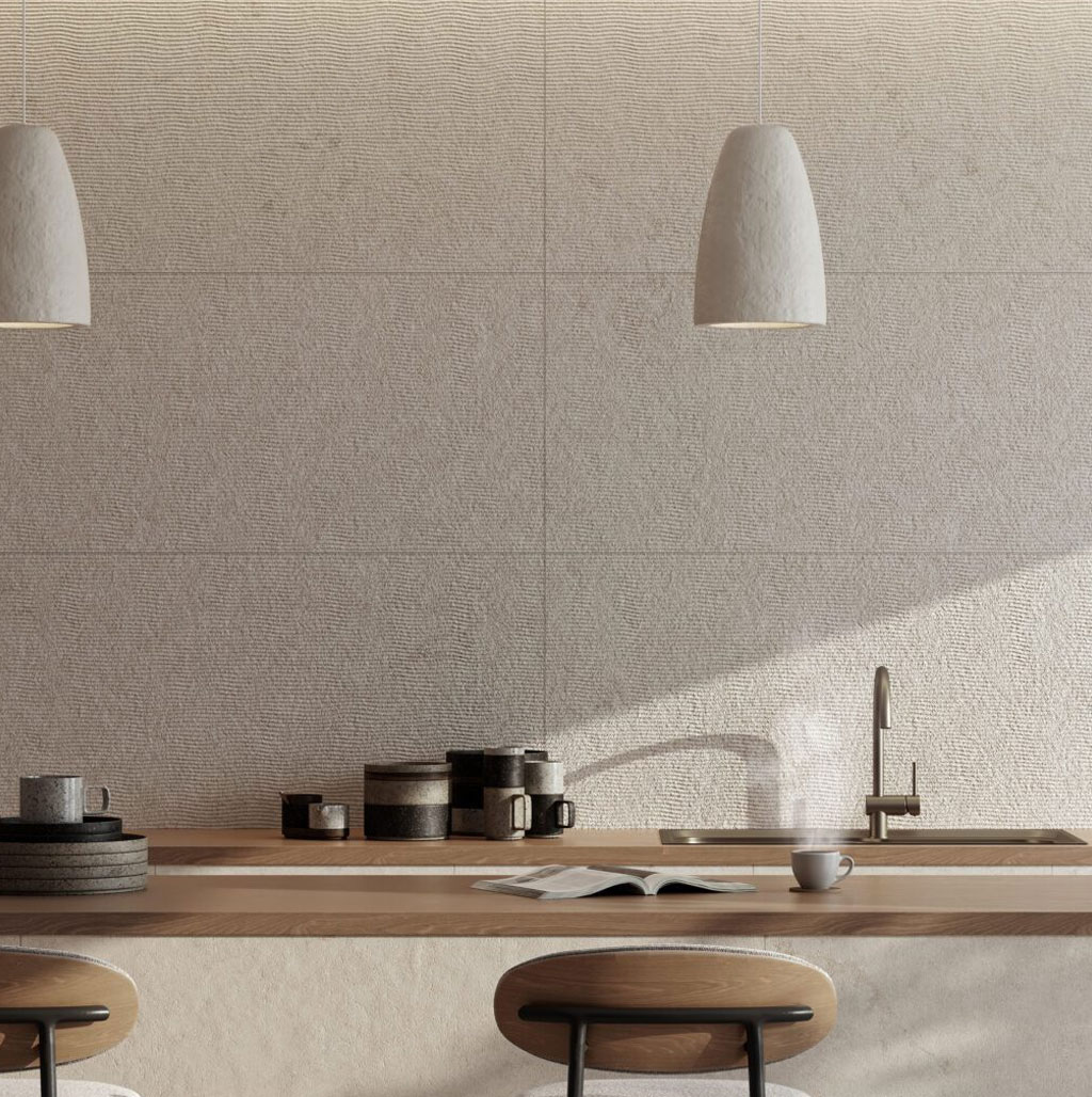 Su textura lineal aporta profundidad visual, ideal para resaltar paredes en baños, cocinas o entradas.
