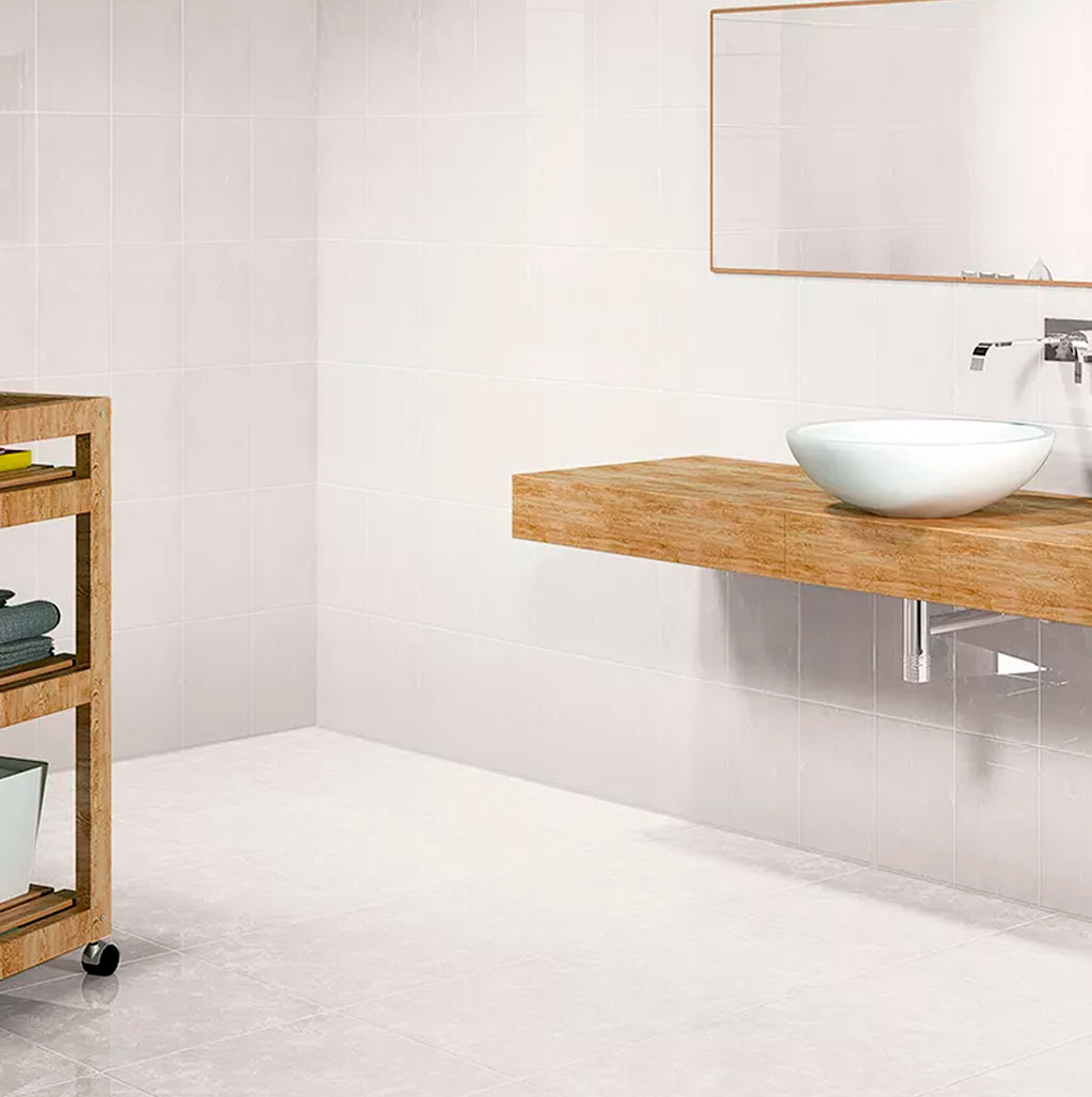 Su acabado brillante aporta luminosidad y sofisticación. Ideal para interiores como salas, comedores y baños.