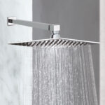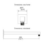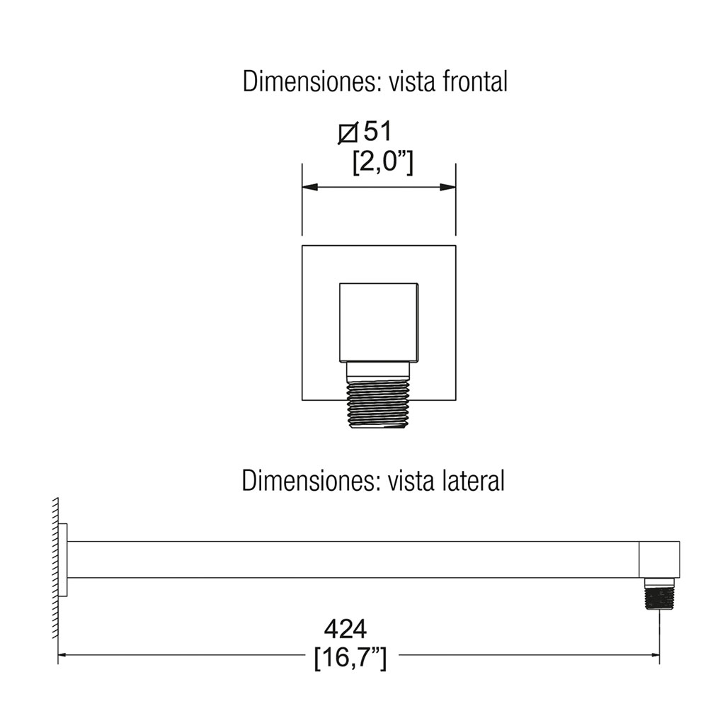Este conjunto incluye un brazo para regadera y un chapetón cuadrado deslizable, ambos en latón con acabado cromo. El brazo se conecta a la pared mediante rosca ½″–14 NPSM y mide aproximadamente 42.4 cm de largo, mientras que el chapetón tiene unos 5.1 cm de ancho.