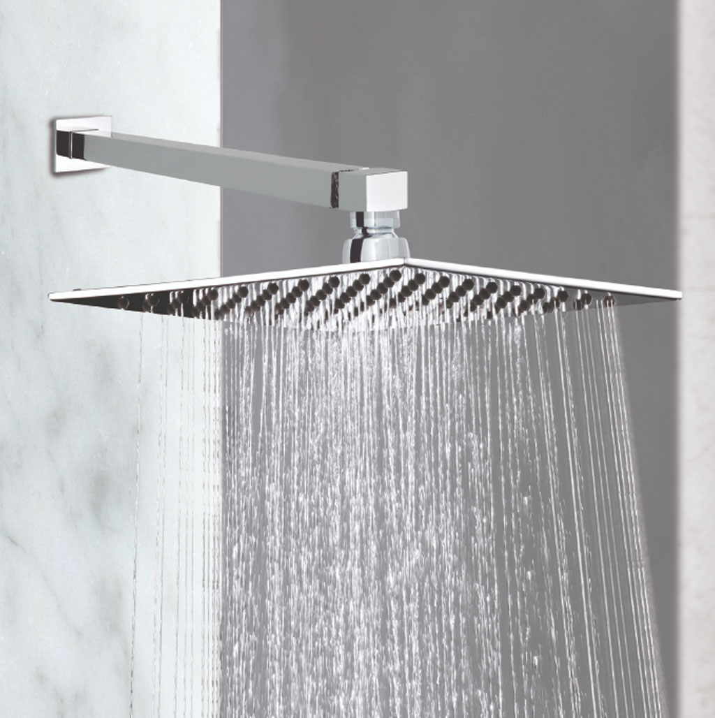 Brazo recto de la línea Kúbica con chapetón cuadrado, fabricado en latón cromado.
