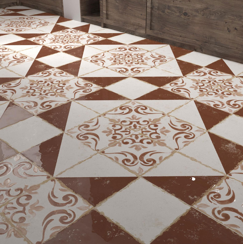 Este azulejo porcelánico de 20×20 cm recupera el espíritu del clásico “mocaoret” valenciano desde una mirada cálida y artesanal, con un diseño que alterna diagonalmente blanco y un envolvente tono teja.