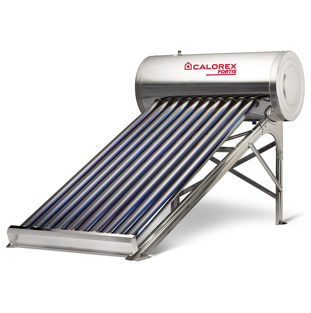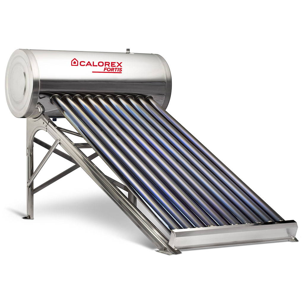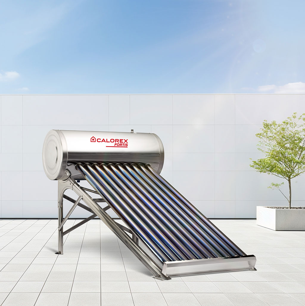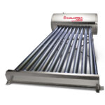 Sistema solar de calentamiento con 10 tubos evacuados y tanque de acero inoxidable, ideal para 2–3 servicios.