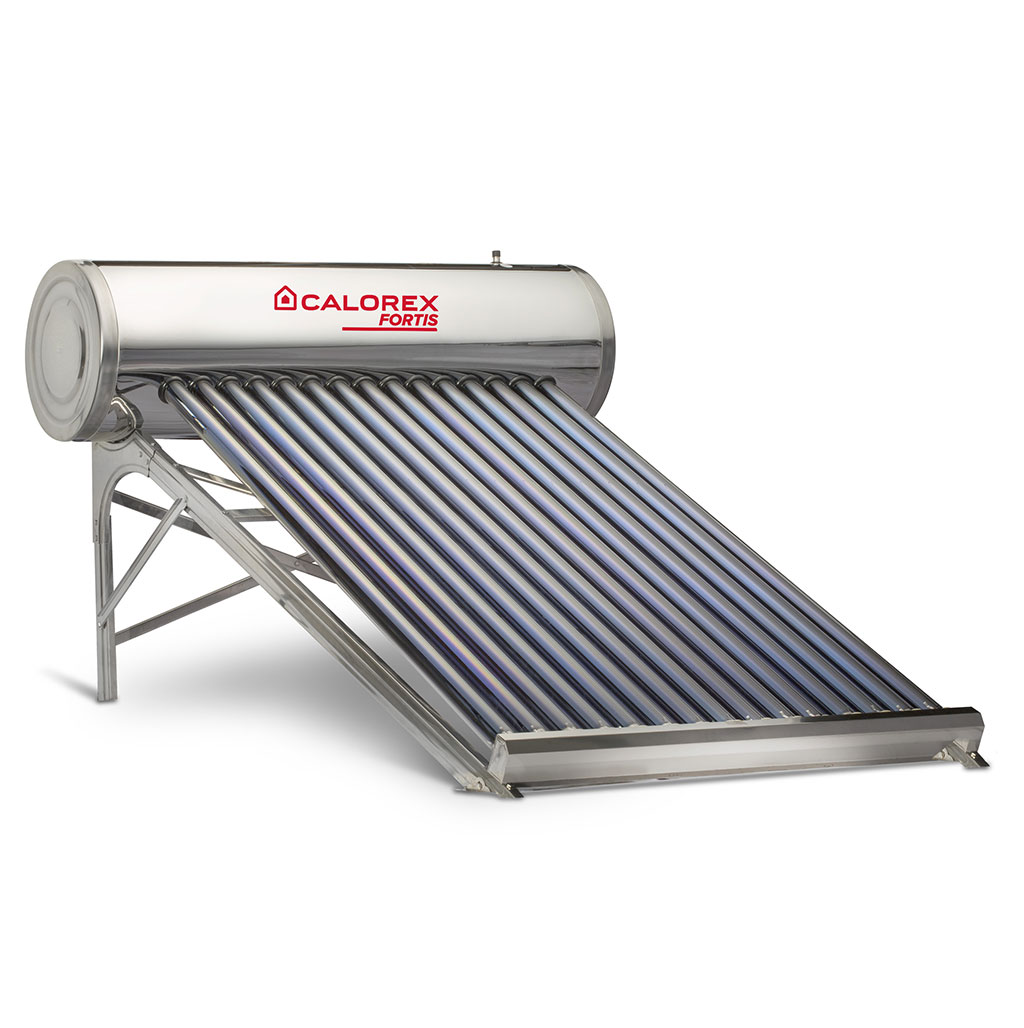 Sistema solar eficiente con 15 tubos evacuados y termotanque de acero inoxidable, ideal para dotar de agua caliente a aproximadamente 4–5 duchas continuas.