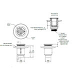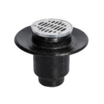 Coladera corta vertical con rejilla redonda removible, fabricada en acero inoxidable pulido y cuerpo de hierro fundido.