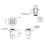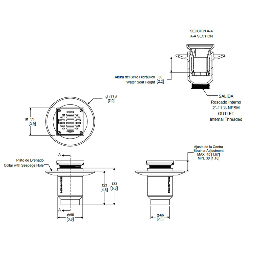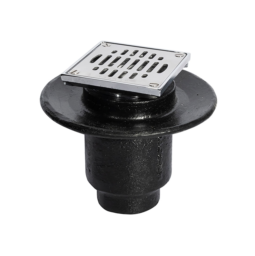 Coladera corta de instalación vertical en piso con rejilla cuadrada superior.