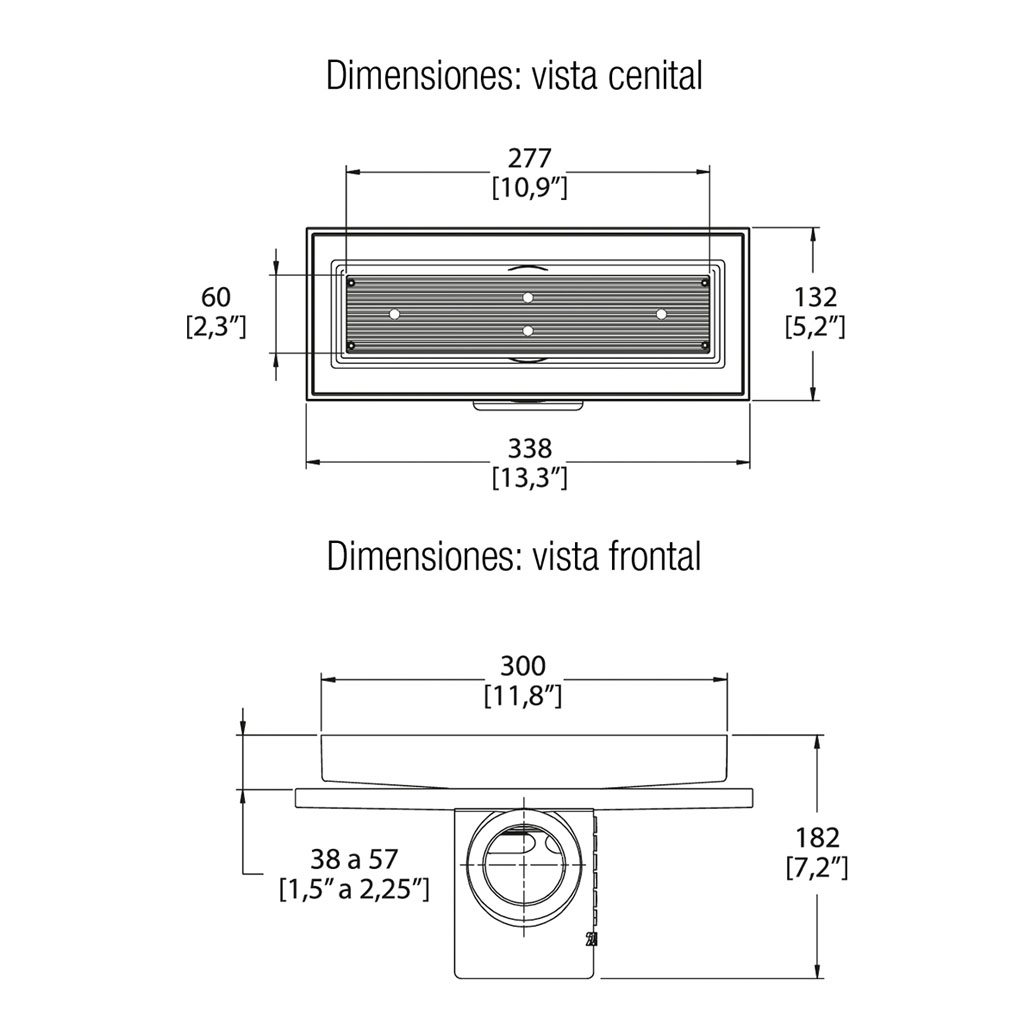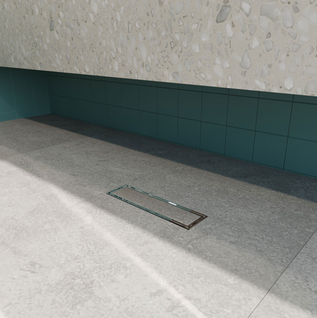 Coladera Helvex tipo canal con marco perimetral e inserto, ideal para regaderas modernas que buscan un desagüe eficiente y estético.