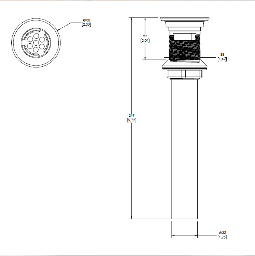 Contra para lavabo con rebosadero estilo “Proyecta”, fabricada en latón cromado, rejilla fija y tubo de 7” (conexión Ø 1¼″).