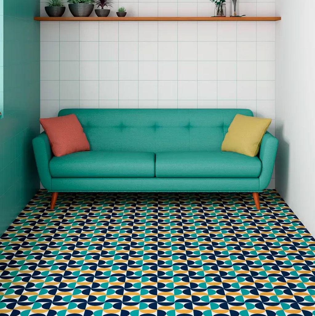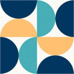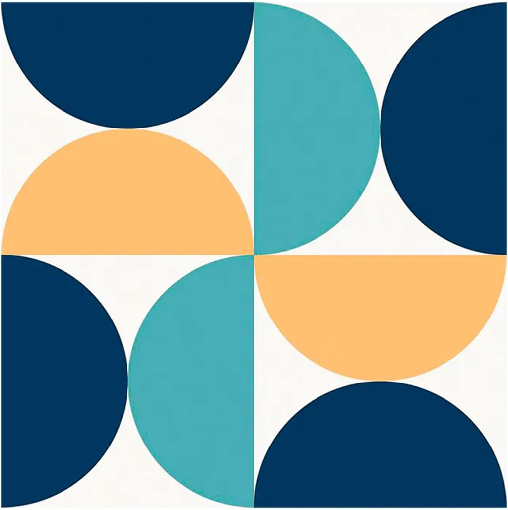 Con un desenfadado patrón de semicírculos inspirado en tendencias de aire retro en tonalidades aguamarina, azul marino, amarillo y blanco.