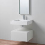 La solución Enc Ras ofrece una encimera monolítica en Krion® con lavabo centrado integrado, preparada para incorporar grifería. Su diseño limpio y uniforme permite continuidad radial en espacios de baño, evitando juntas visibles y facilitando la limpieza.