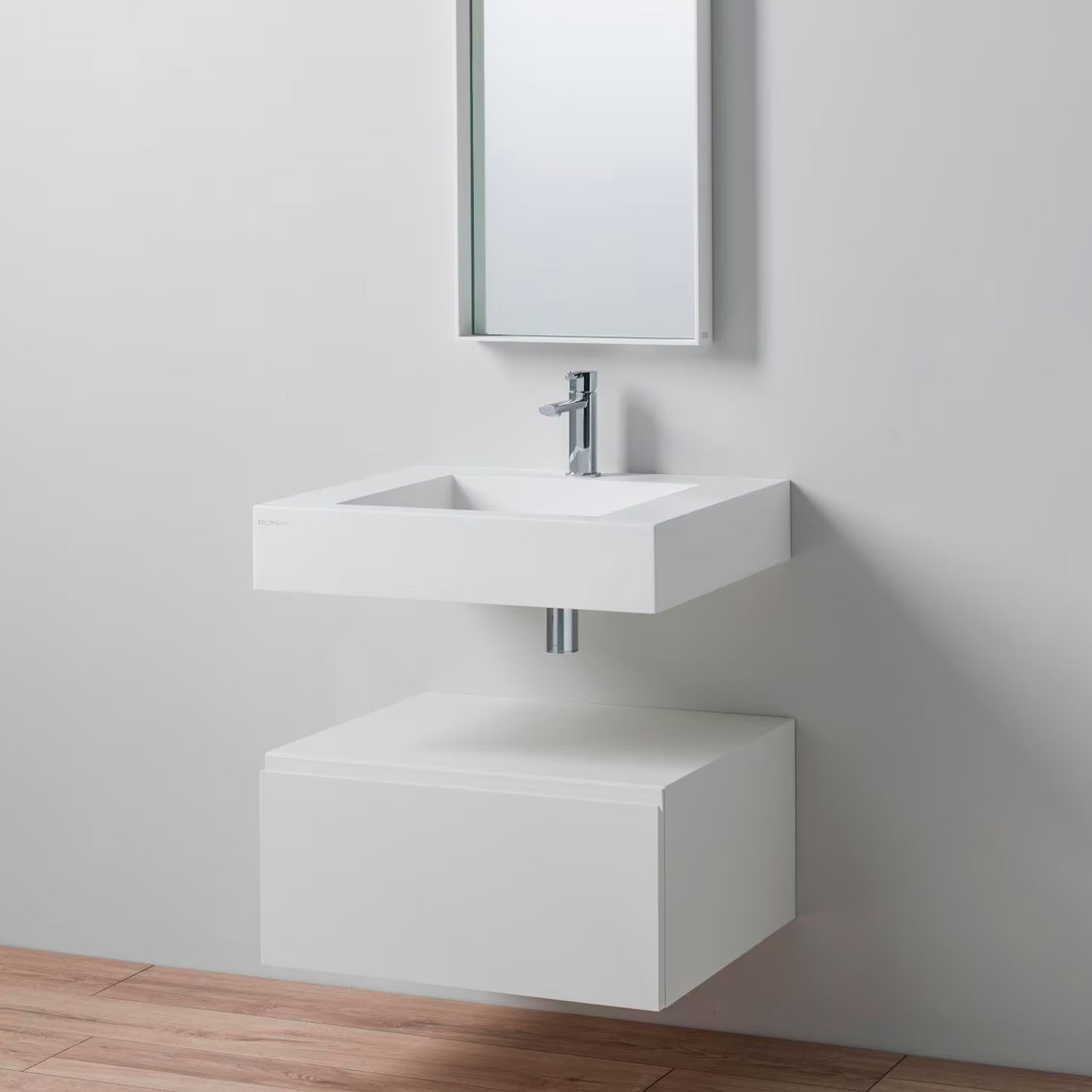 Encimera Ras en blanco con lavabo centrado integrado y grifería.