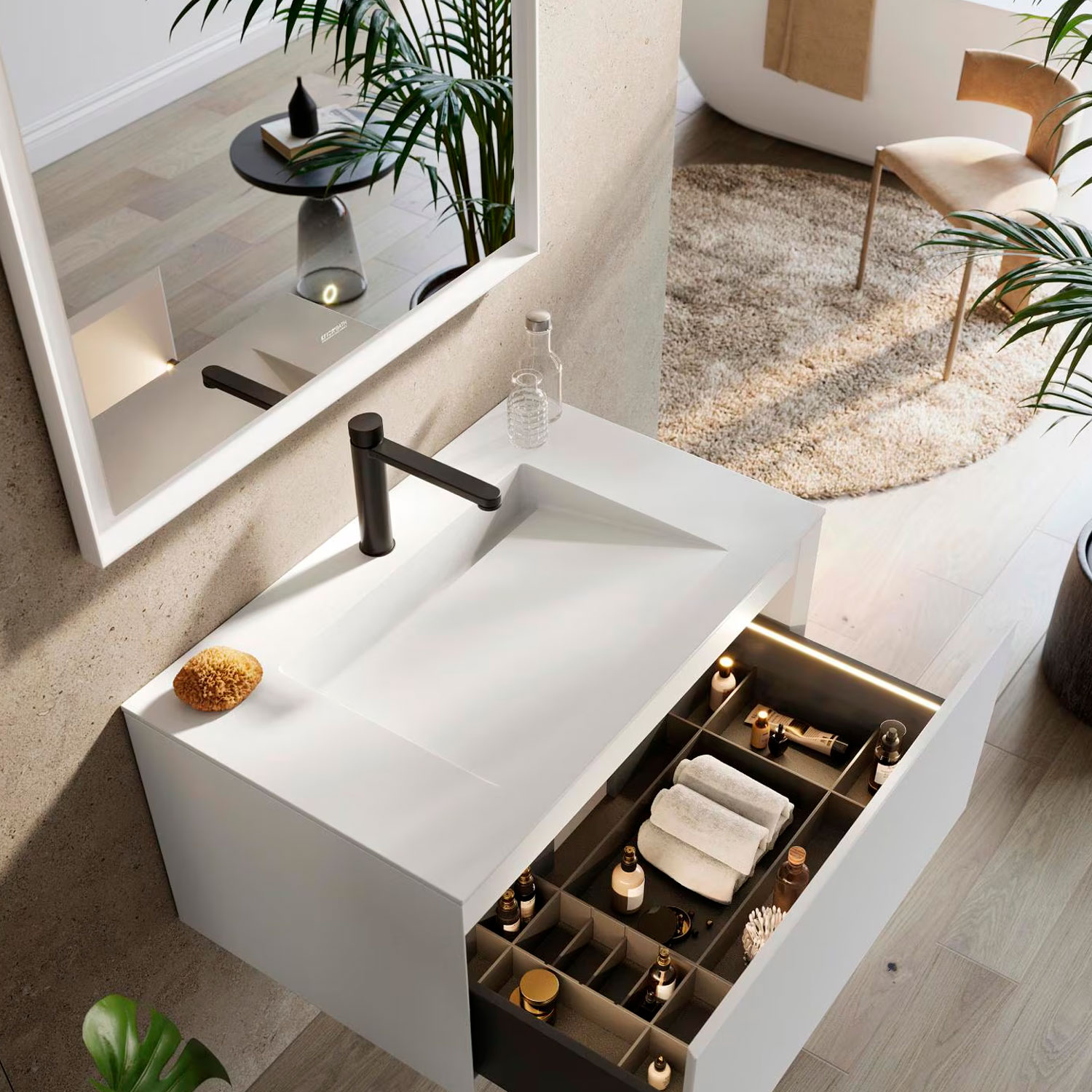 La serie Ner de encimeras en Krion® es reconocida por su estética depurada, superficies homogéneas y resistencia. Pensada para baños contemporáneos, permite soluciones con lavabo integrado y continuidad visual que refuerzan la sensación de pureza en el espacio.