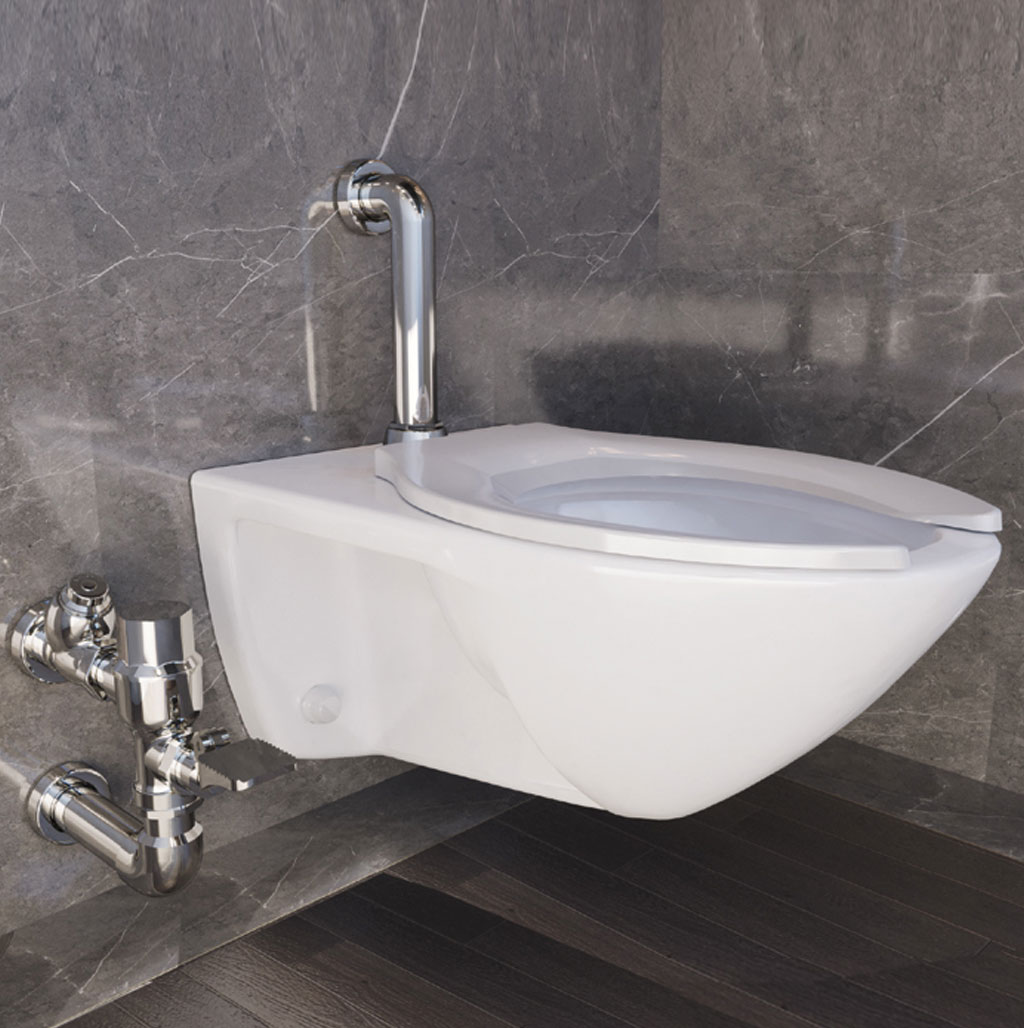 Fluxómetro Helvex de pedal oculto para WC, con descarga de 4.8 L/s, ideal para baños institucionales que priorizan higiene y rendimiento.