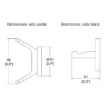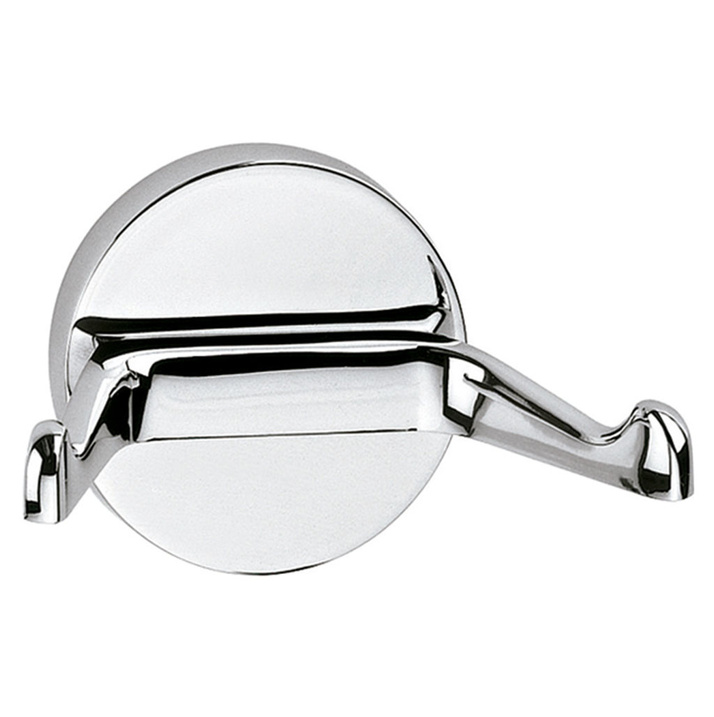 Evolución del modelo 106, este gancho doble mantiene la estructura semiempotrada en latón con acabado cromado brillante.