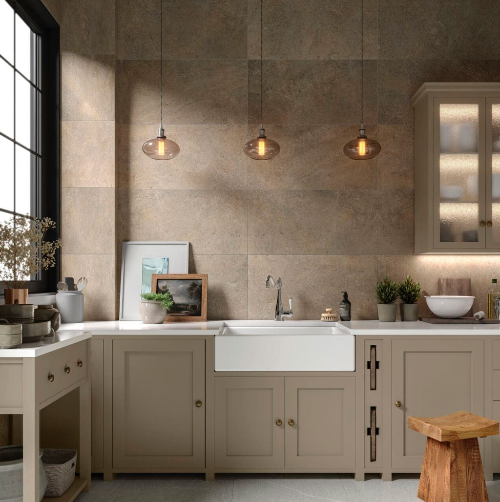 Gaudí es un recubrimiento cerámico de pasta super gres tipo piedra en formato 45 × 90 cm rectificado, con acabado mate, ideal para pisos y muros en interiores y exteriores residenciales o comerciales como cocinas, baños, salas, recámaras, comedores, pasillos, estudios, terrazas, patios, cocheras, fachadas y albercas.