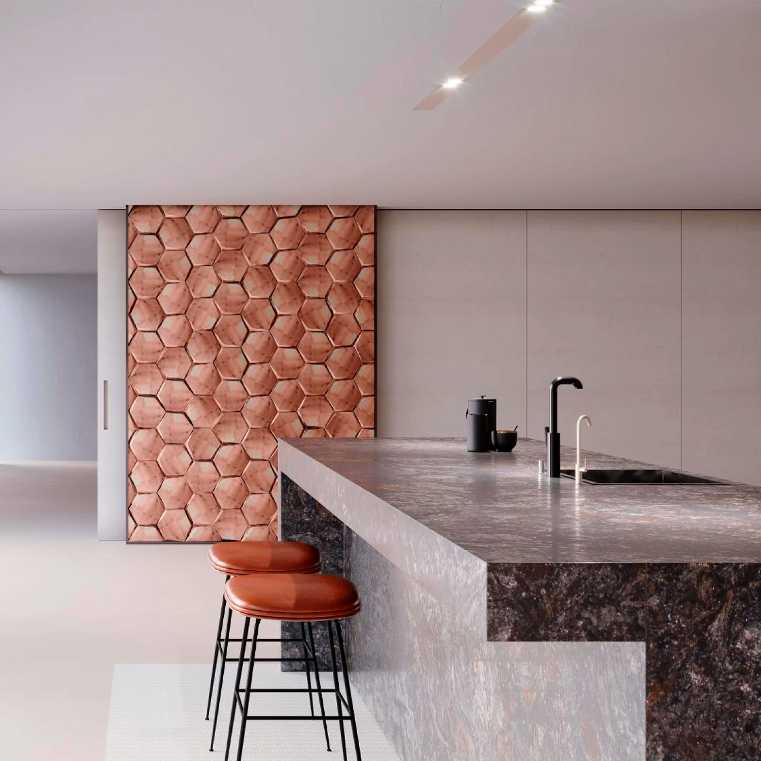 Este revestimiento metálico en aluminio combina un tono cobrizo cálido con superficies suaves y detalle minimalista. Ideal para interiores modernos que buscan un toque metálico y sofisticado sin recurrir a acabados oscuros intensos.