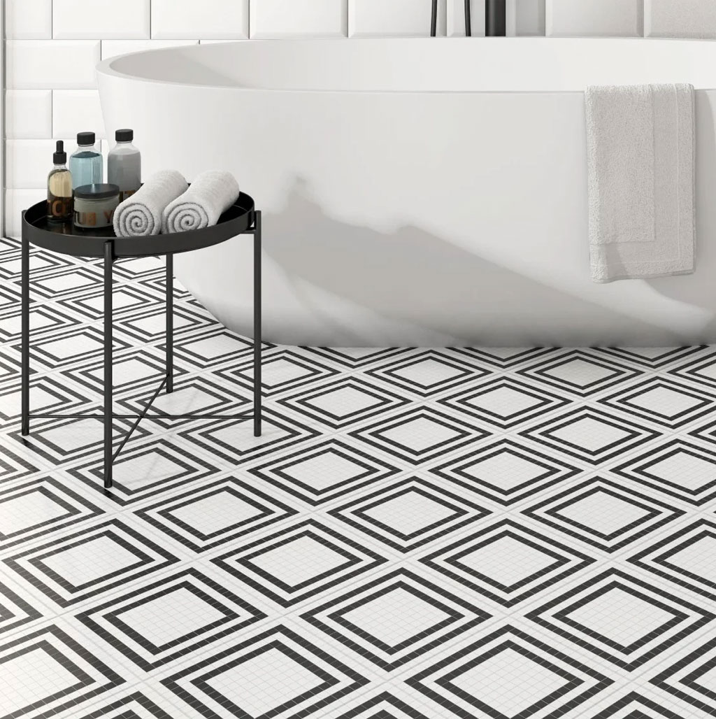 Dune presenta grid, es un azulejo en porcelánico de gráficas geométricas, juega con el positivo y el negativo, el yin y el yang, para decoraciones auténticas.