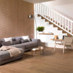 Revestimiento cerámico inspirado en la madera natural, tono almendra y acabado mate.