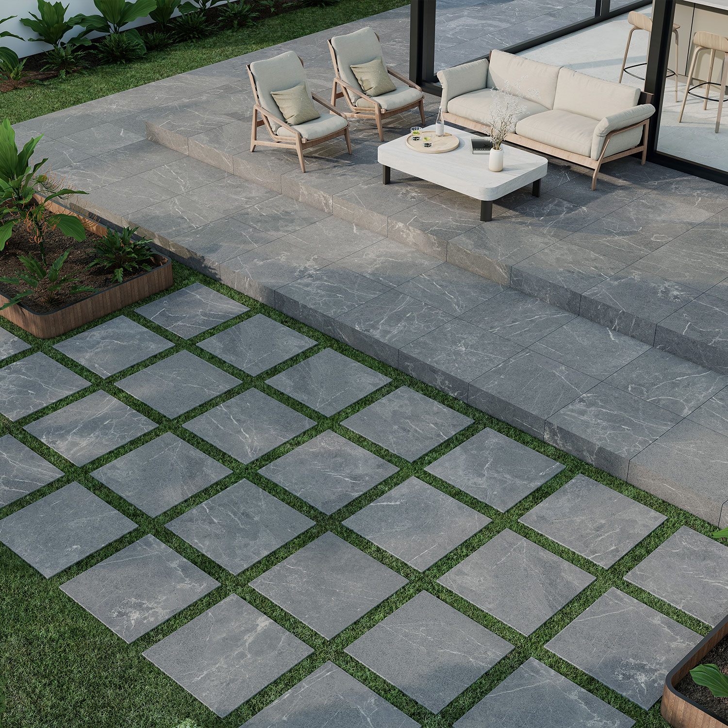 Indigo Pavers combina profundidad cromática y alto rendimiento. El porcelanato gris oscuro 20 mm para exterior en formato 60×60 cm destaca por su acabado grip, ideal para áreas exteriores y húmedas.