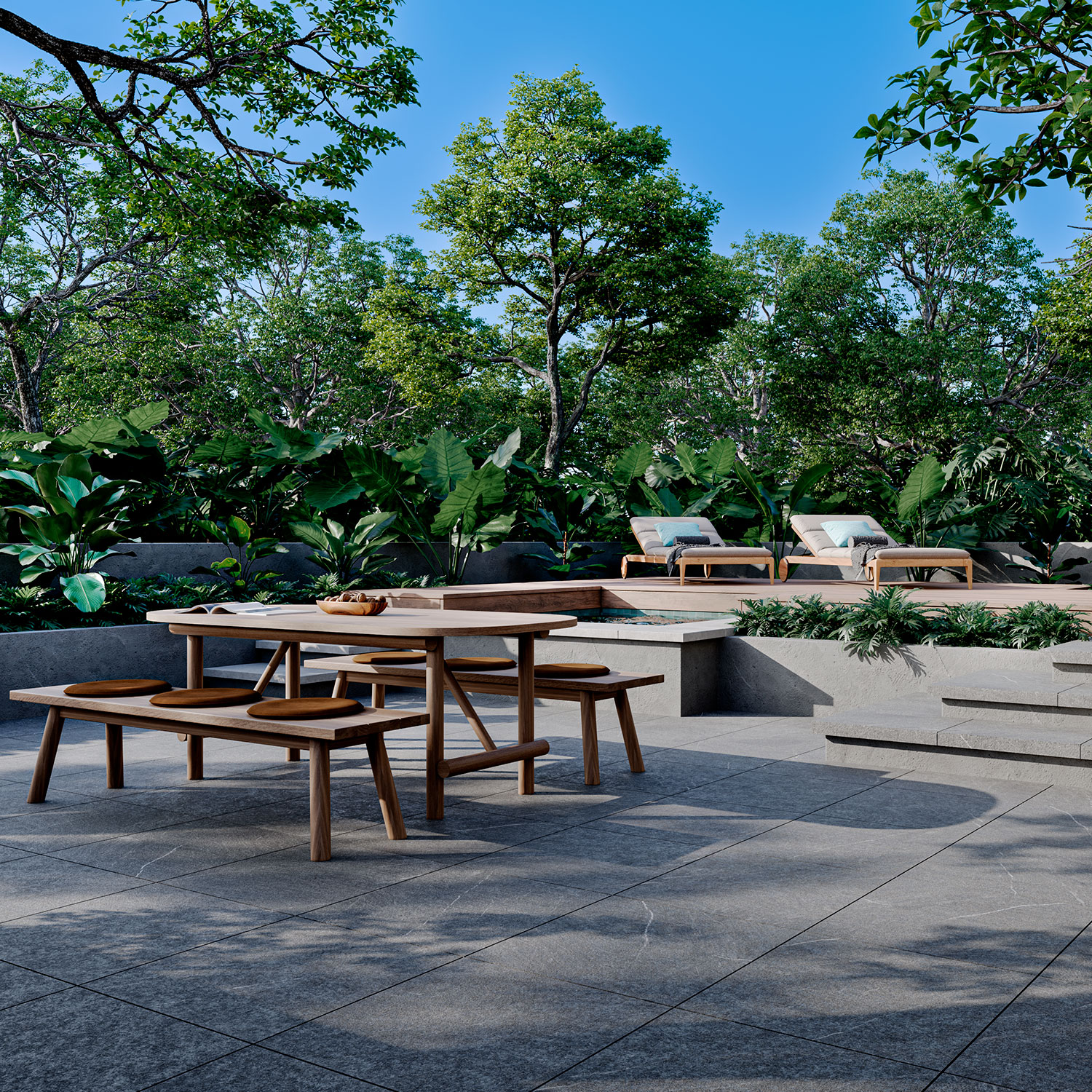 Kiel Dark Pavers captura la fuerza visual de la piedra contemporánea en un porcelanato tipo piedra de 20 mm para exterior en formato 60×60 cm.