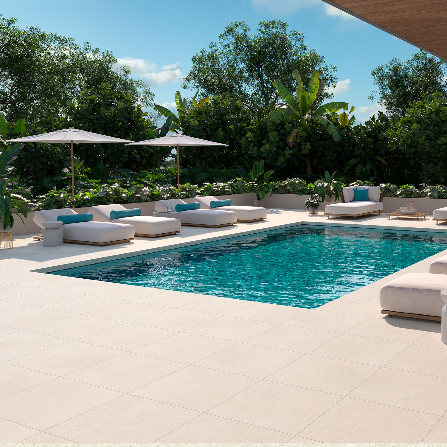 Kiel Sand Pavers refleja la calidez de la piedra actual en un porcelanato tipo piedra de 20 mm para exterior con formato 60×60 cm.