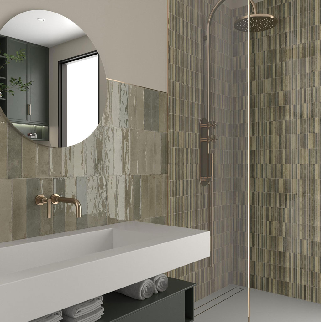 Su diseño en formato mosaico ‘finger’ alargado, su acabado ultragloss y su aspecto destonificado, potencian la profundidad del color, creando reflejos dinámicos que varían según la incidencia de la luz.