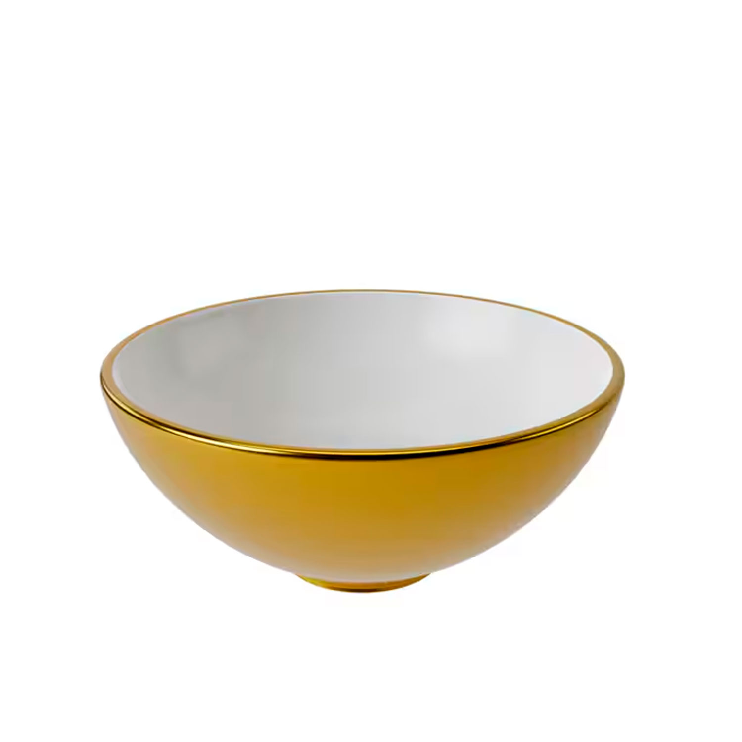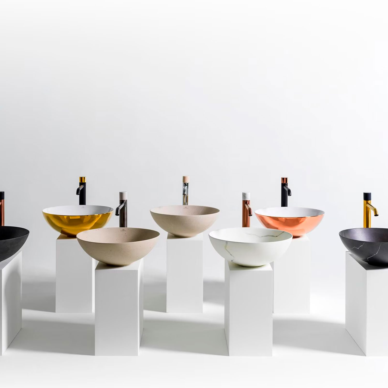 Lavabo de apoyo con superficie lisa y sin rebosadero visible.