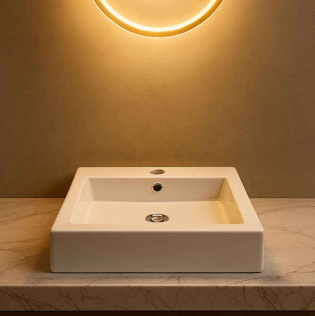 Lavabo de cerámica Kub con orificio para grifería monomando, acabado brillante, ideal para instalaciones modernas y minimalistas.