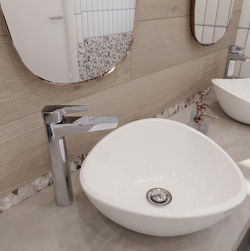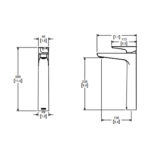 Versión alta para lavabos tipo sobreponer. Conserva cartucho cerámico, aireador oculto, y acabado cromo elegante. Opera en el mismo rango de presión (0.25–6 kg/cm²), con conexiones ½″‑14 NPSM. Ideal para estilos modernos y minimalistas