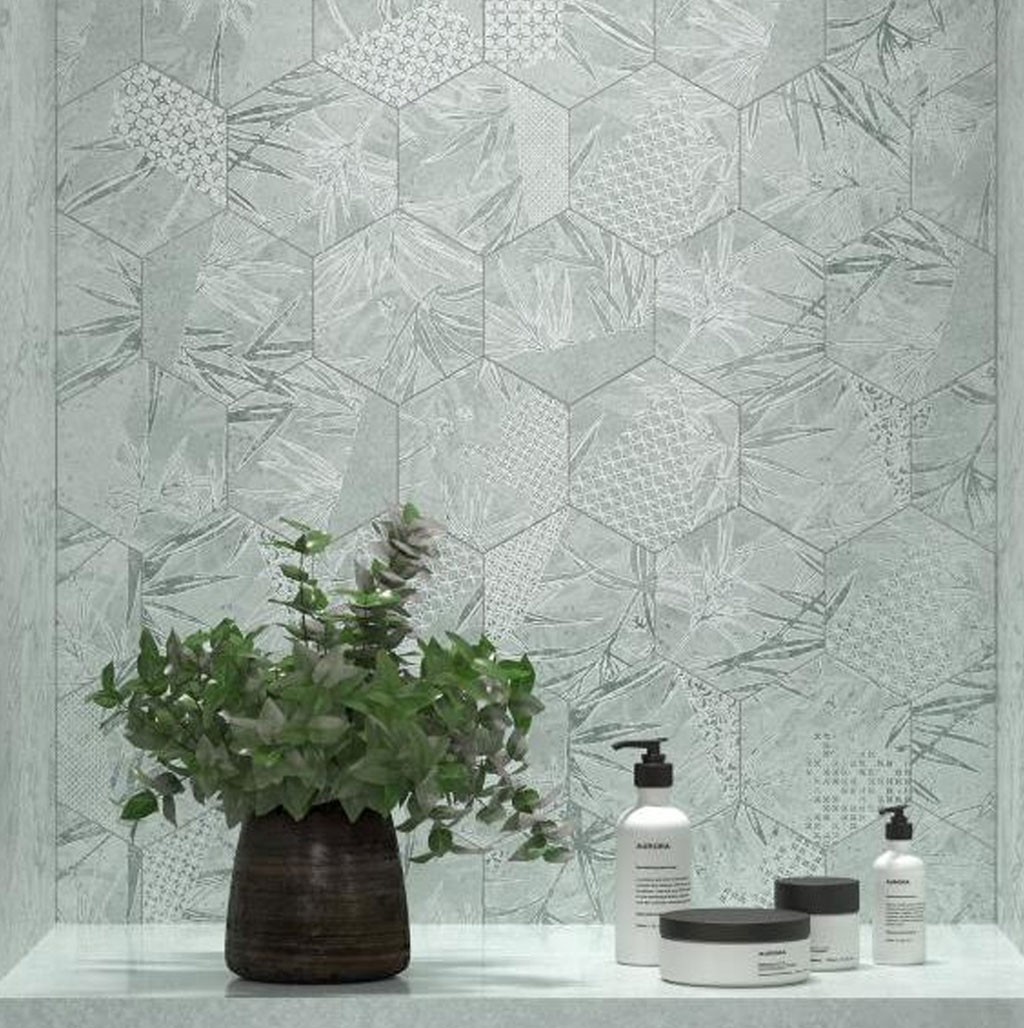 Azulejo porcelánico 15×17 cm, color gris claro con acabado satinado y diseño biofílico, ideal para interiores, muros, suelos, duchas y piscinas.
