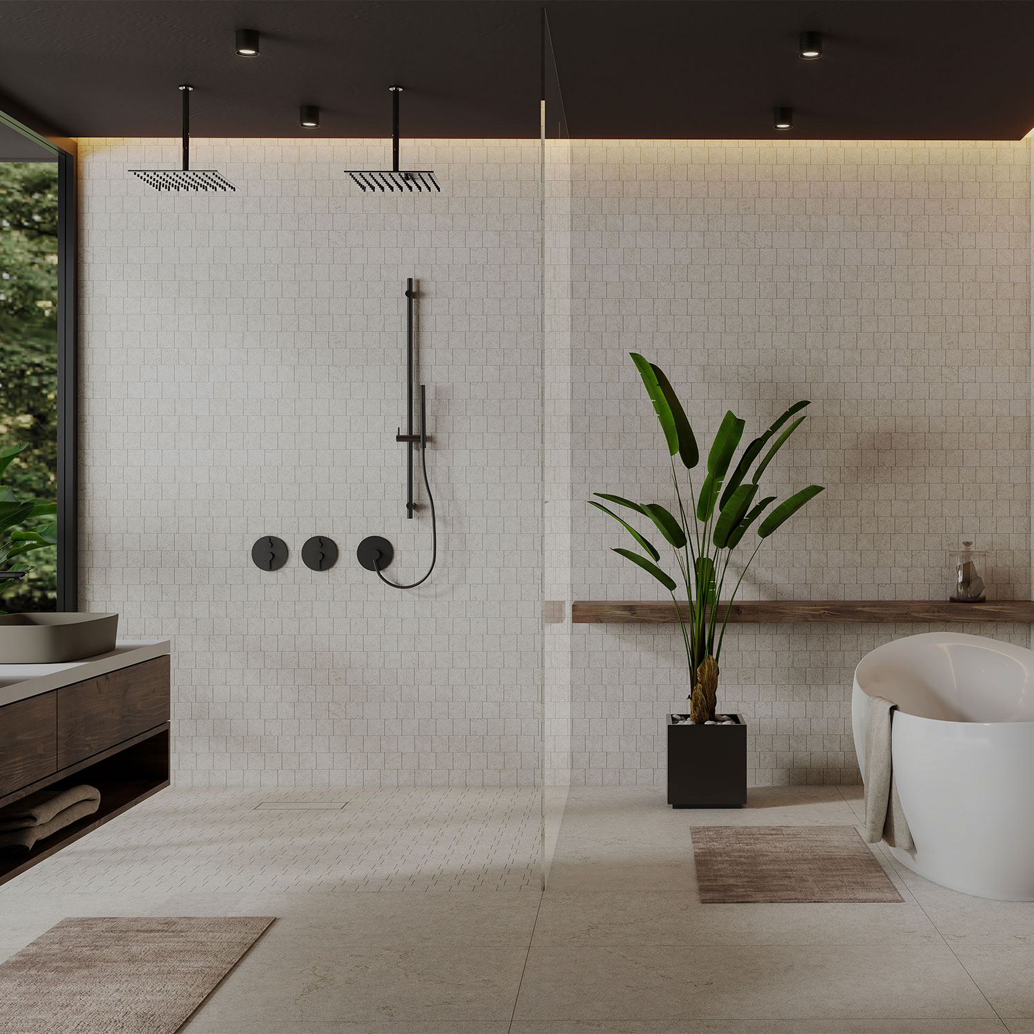 Este formato permite aplicaciones en pisos y muros, facilitando composiciones detalladas en baños, cocinas, regaderas y muros de acento, manteniendo continuidad visual con otros formatos del mismo acabado.