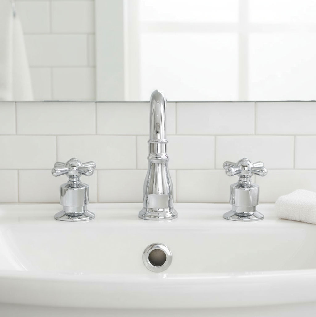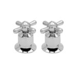 Juego de manerales cruceta estilo Niza en acabado cromado, diseñado para controlar de forma clásica el flujo de agua en mezcladoras o llaves de baño.