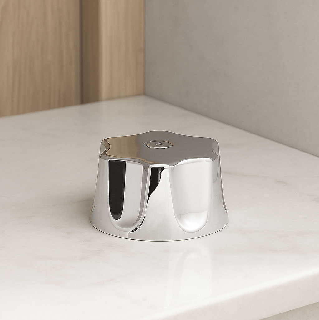 Maneral individual de la línea Queen, fabricado en materiales resistentes con acabado brillante, pensado para dar un toque refinado a griferías y mezcladoras.