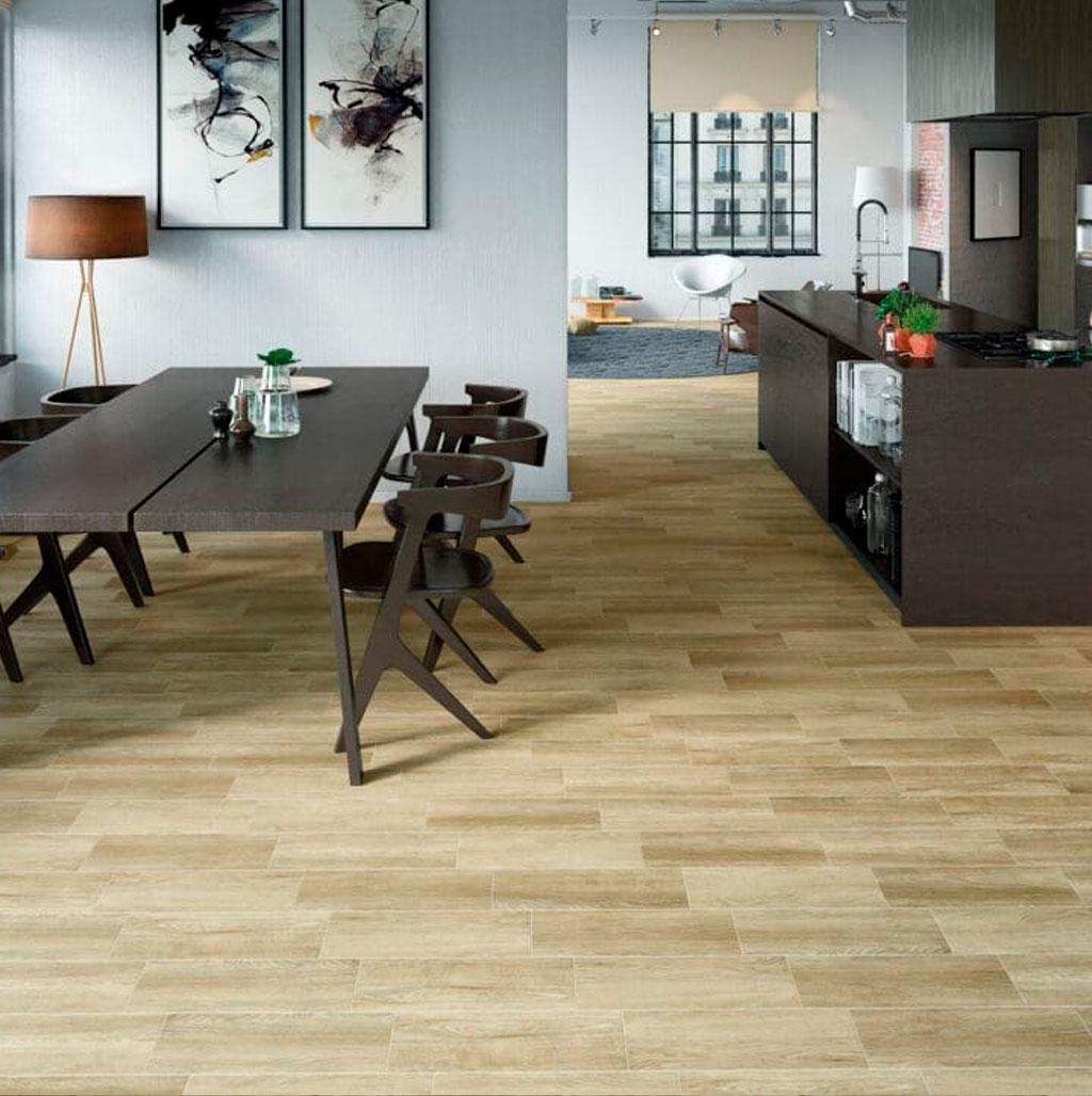 Memphis es un recubrimiento cerámico de pasta blanca tipo madera en formato 20 × 60 cm rectificado, con acabado mate y textura realista, ideal para pisos y muros en interiores y exteriores residenciales o comerciales.