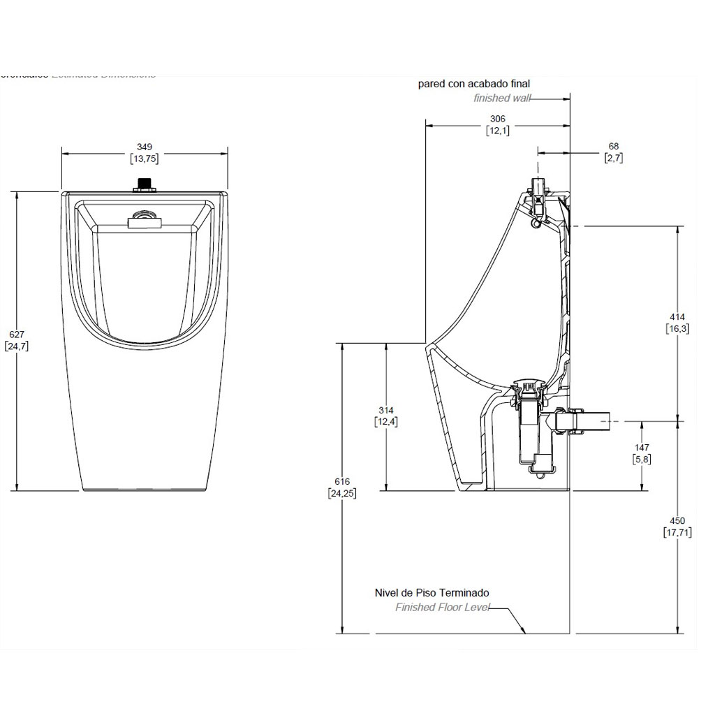 Opera con fluxómetro de 0.5 o 1 lpd y sistema de drenado hidráulico TDS2 (doble esfera), que evita malos olores sin uso de agua. Diseño compacto y resistente.