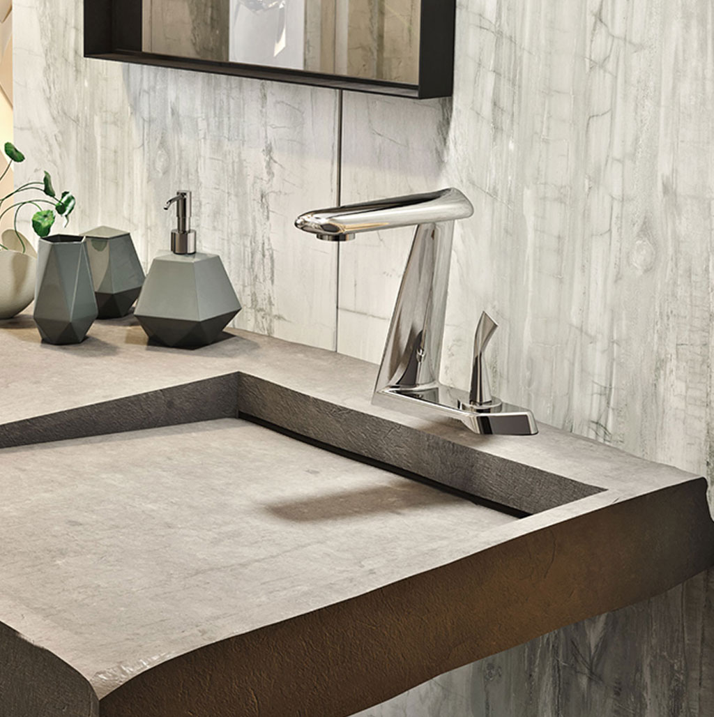 Monomando de lavabo de estilo minimalista con aireador oculto y contra push, para instalación en cubiertas y lavabos sin rebosadero.