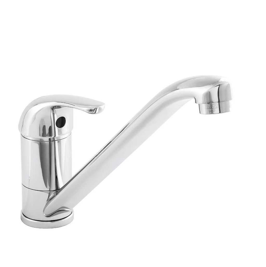 Llave monomando para fregadero, fabricada en latón con acabado cromo, incluye cartucho progresivo y aireador limpia-fácil, ideal para uso diario en cocina.
