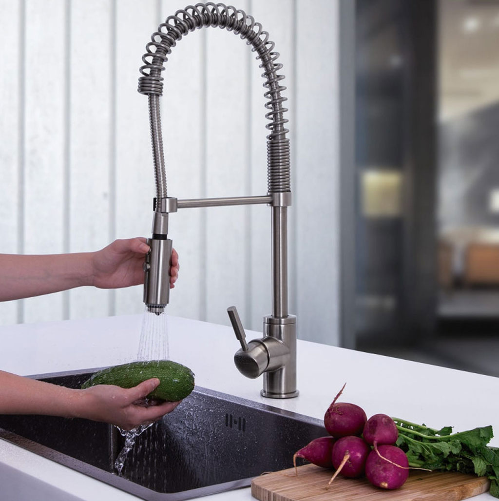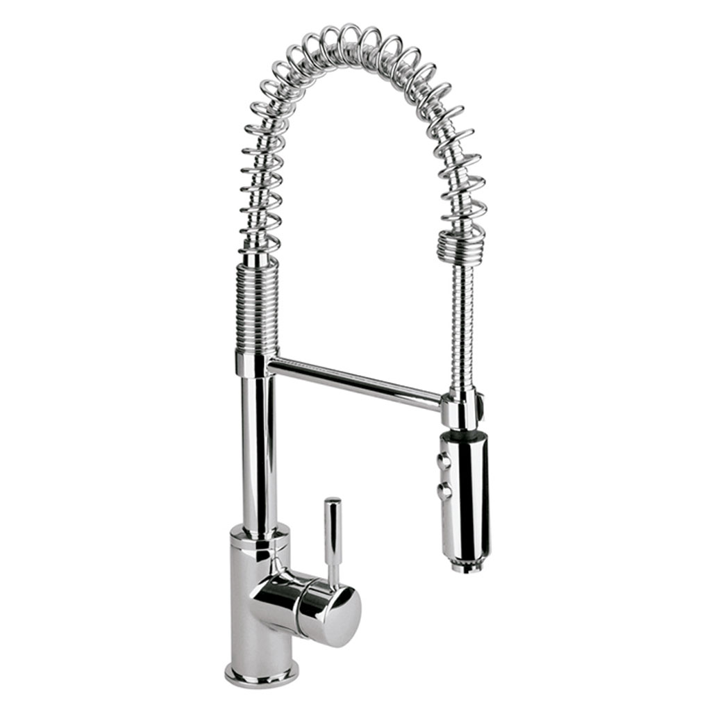 Mezcladora profesional con cuello giratorio, resorte, manguera flexible de 61 cm y doble tipo de chorro.