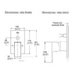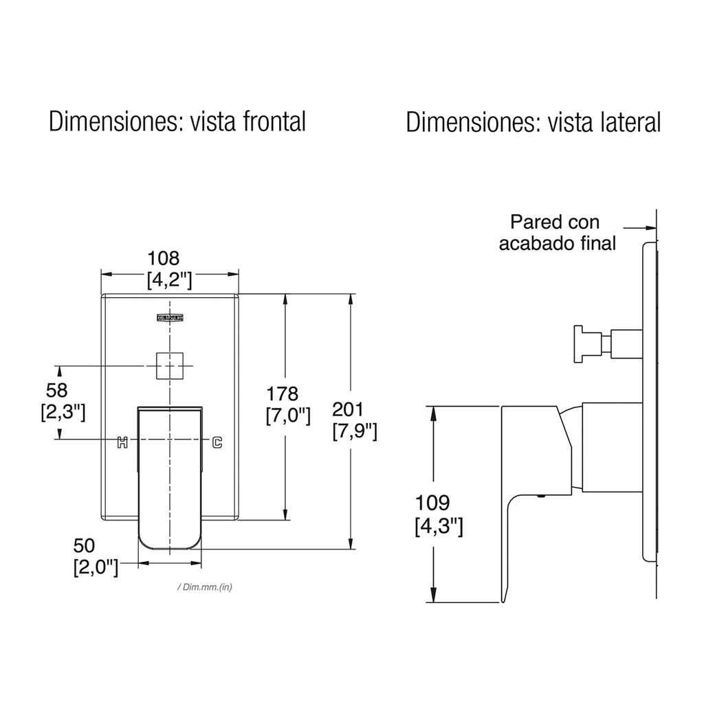 Cuadro de diseño limpio y discreto, fabricado en latón con cartucho cerámico Ø 40 mm. Apto para regadera, tina o regadera manual y presión mínima de 0.80 kg/cm².