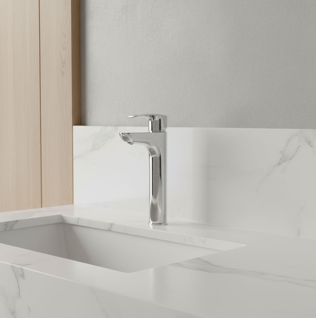 Monomando alto para lavabo de la línea Yaz, con diseño moderno y acabado cromado, que proporciona un control preciso del flujo de agua.