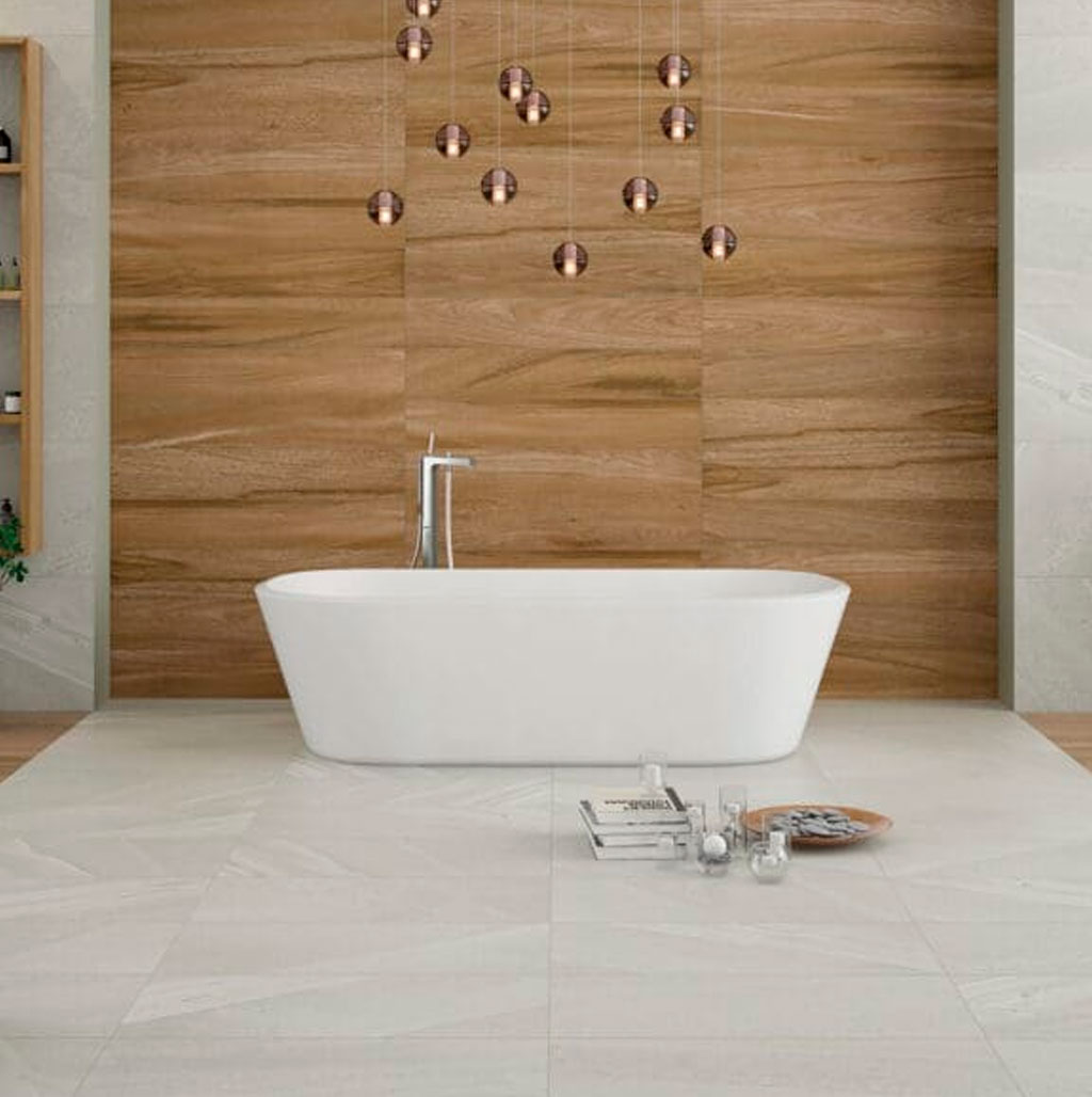 Piamont es un revestimiento tipo piedra de pasta súper gres en formatos 45 × 90 cm y 60 × 60 cm rectificado, con acabado mate antideslizante, ideal para pisos y muros en interiores y exteriores residenciales o comerciales con alto tráfico