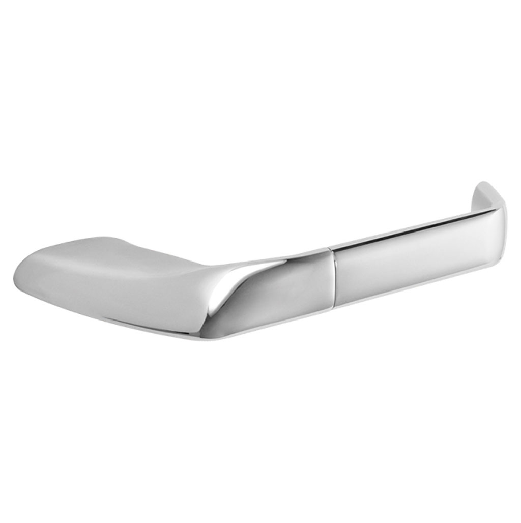 Soporte mural para papel higiénico de latón cromado con instalación semi‑empotrada.