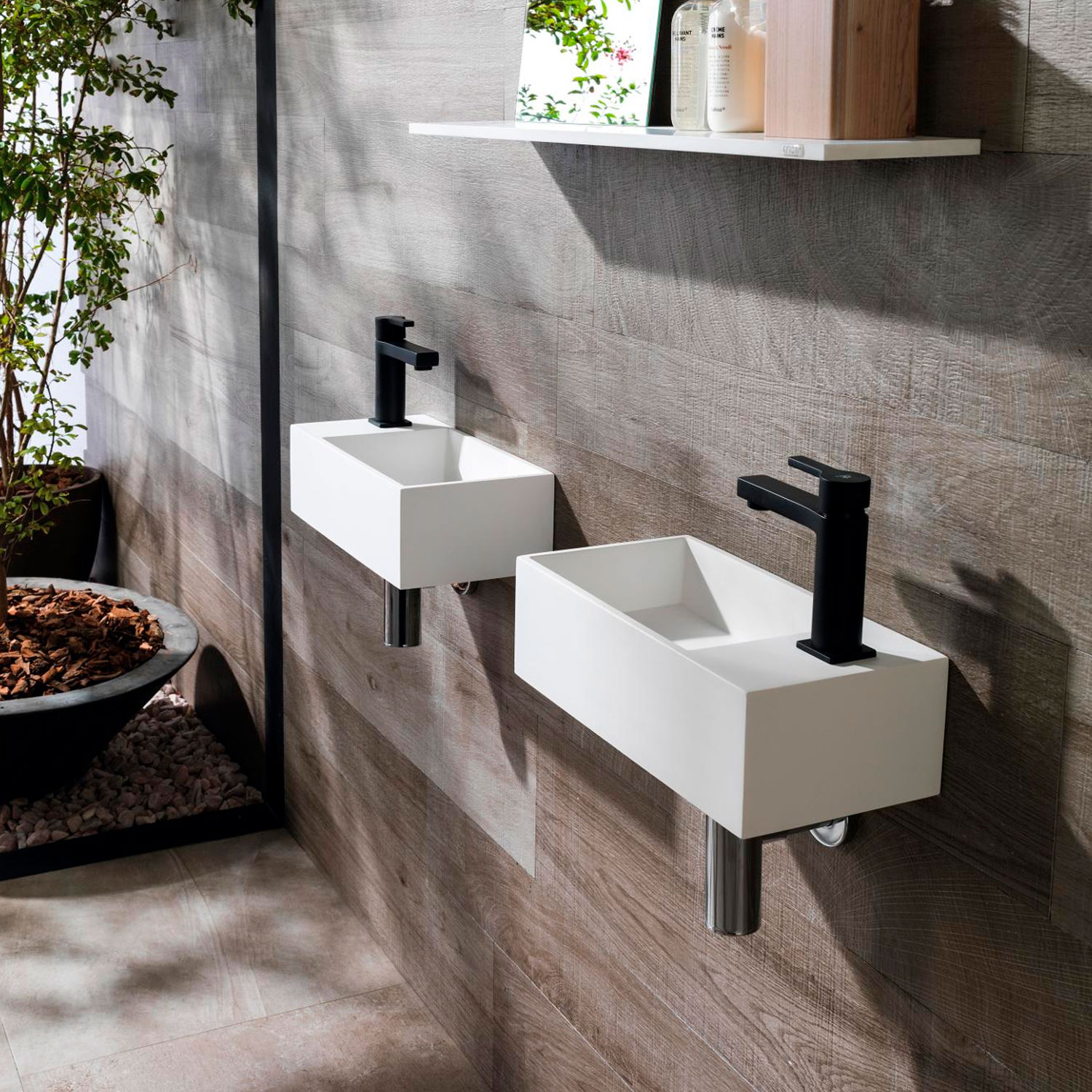 Modulo Ras en blanco con lavabo integrado a la derecha e inclusión de grifería.