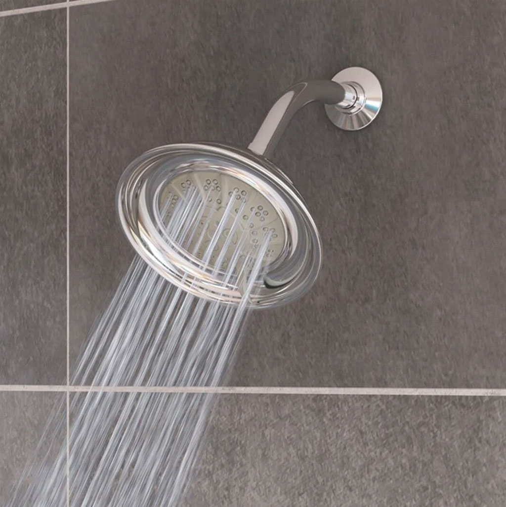 Regadera redonda de plato ancho de 7″ (≈ 17.7 cm) con sistema multichorro de 6 tipos de chorro controlados mediante una palanca en el centro del plato. Incluye brazo de latón y chapetón cromado
