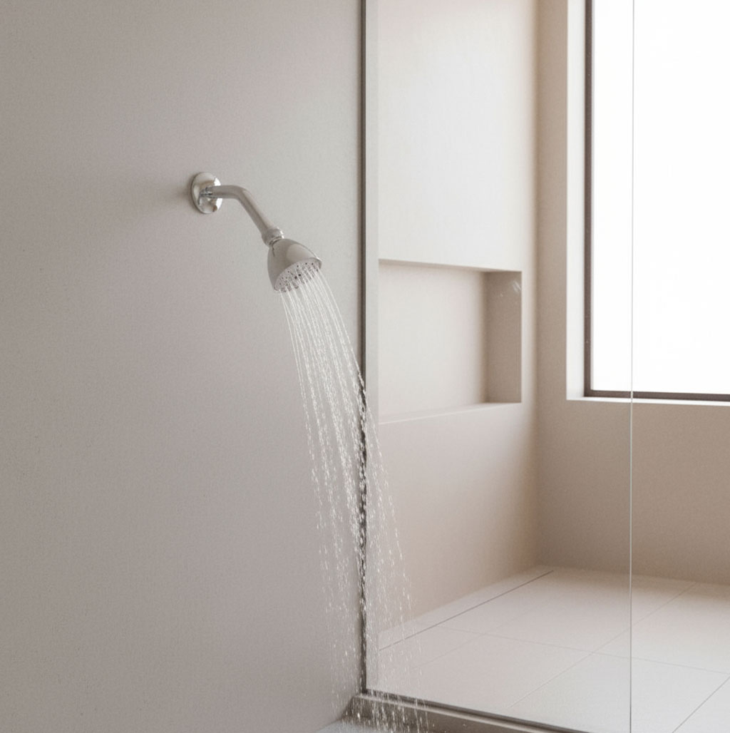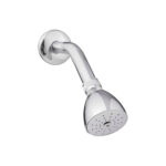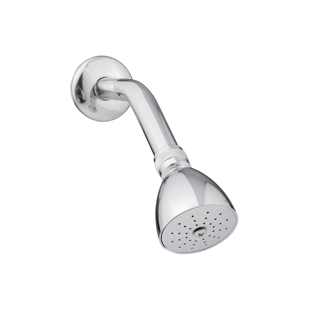 Regadera con brazo y chapetón de 8.6 cm de diámetro, acabado brillante, pensada para baños donde se desea un chorro más directo y eficiente.