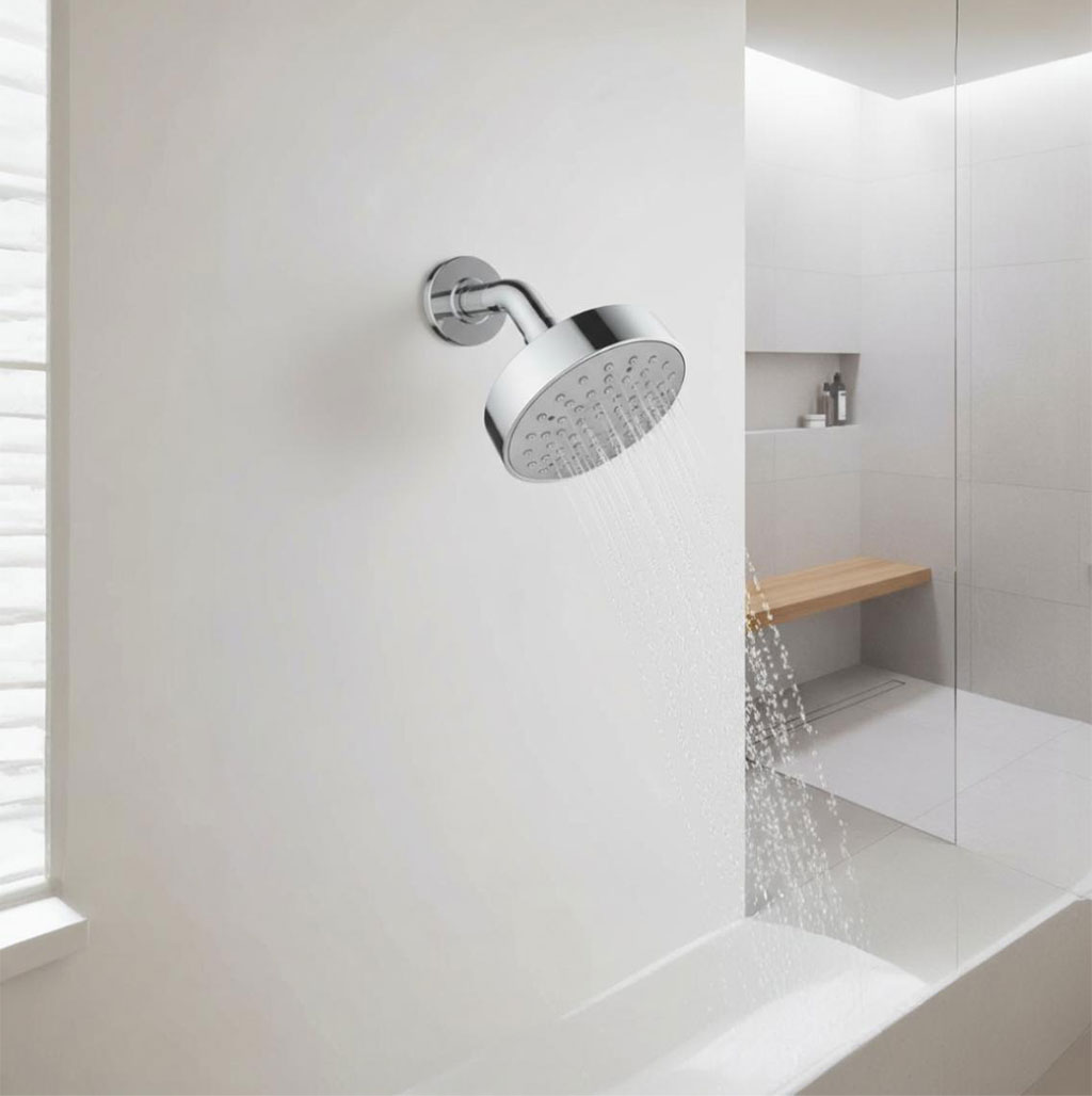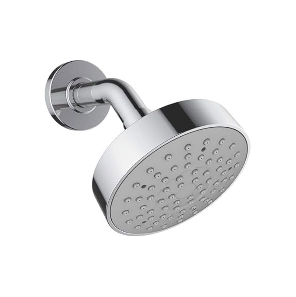 Regadera con brazo fijo y chapetón metálico, diseñada para una instalación estándar de pared.