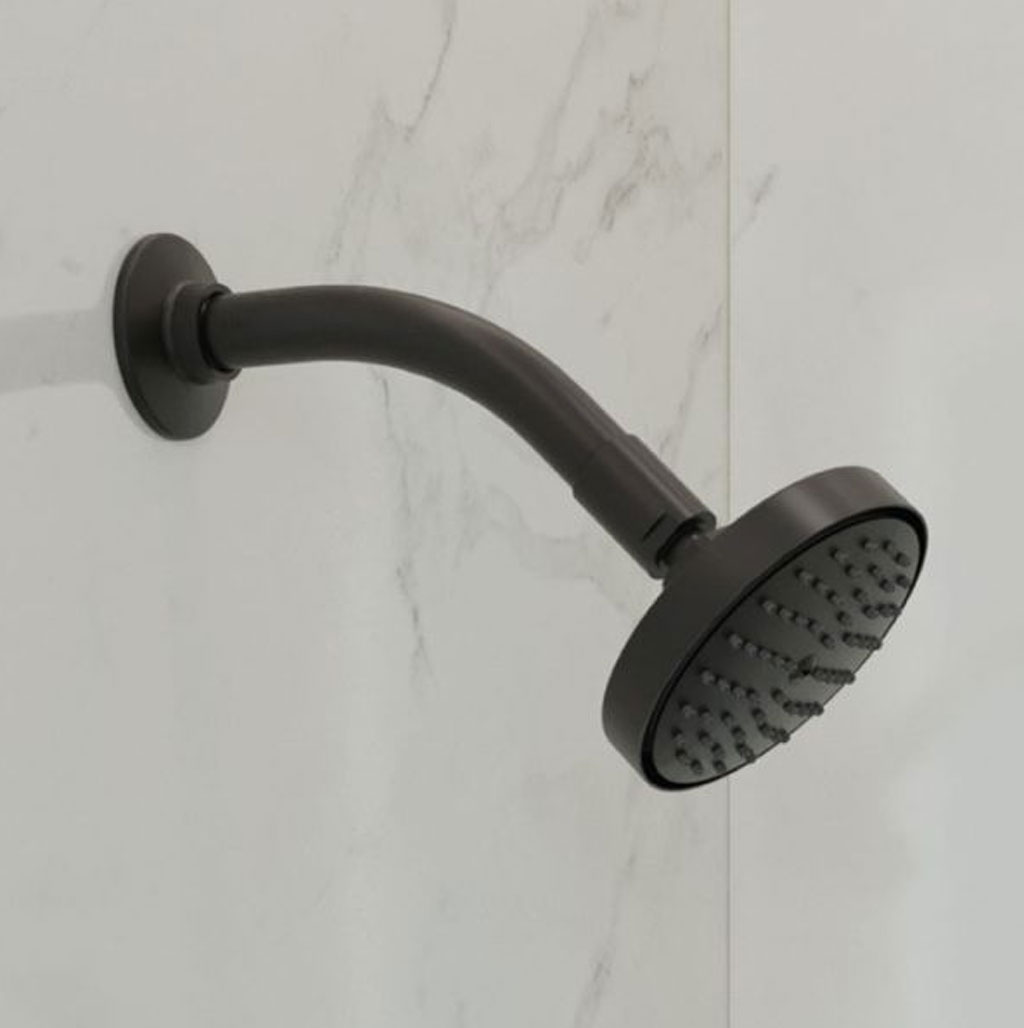Regadera de chorro fijo con sistema anticalcáreo, brazo, chapetón y nudo móvil de latón.