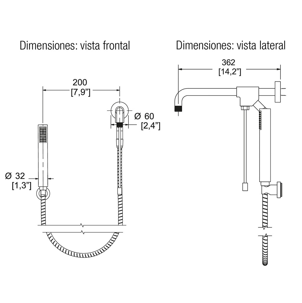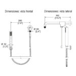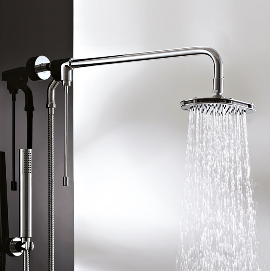 Set que integra mano ducha con desviador integrado y brazo angular para duchas de plato ancho. Incluye cabezal anticalcáreo, nudo móvil y conexión de ½″–14 NPT. Opera con una presión mínima recomendada de 1.0 kg/cm².