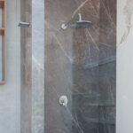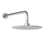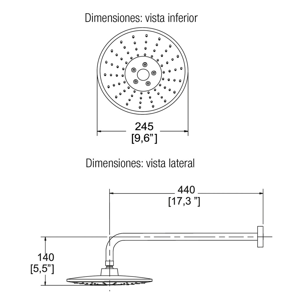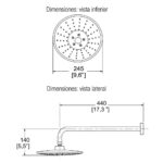 De diseño moderno, este plato grande (≈25–44 cm diámetro) permite tres modos de chorro mediante botón central. Incluye brazo angular de 90° y chapetón, cuerpo de latón.